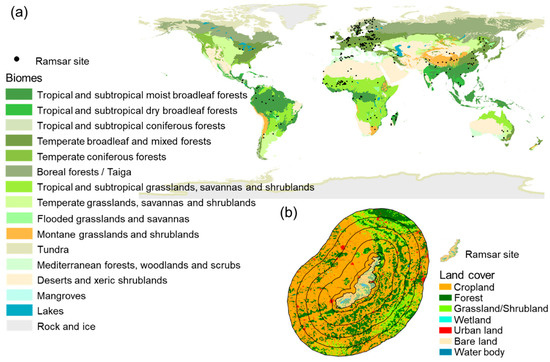 (a) Inland natural wetlands of 334 filtered Ramsar sites grouped by biome. (b) The landscape context was measured at multiple spatial scales using buffering analysis. The areas of nested buffer zones were 1, 5, 10, 15 and 20 times the area of the Ramsar site. The attributes of landscape context were quantified within each buffer zone (note that Ramsar sites were excluded).