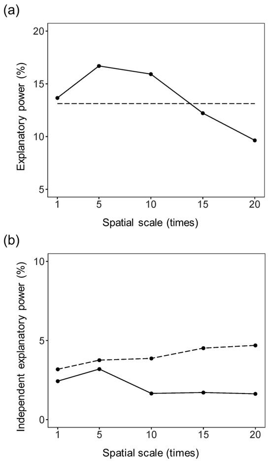 (a) The explanatory power and (b) the independent explanatory power of landscape context (solid lines) and landscapes within wetland (dashed lines) for the species richness of threatened avifauna. The attributes of landscape context were quantified at multiple spatial scales, i.e., 1, 5, 10, 15 and 20 times the area of each Ramsar site.