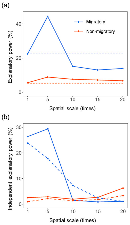 (a) The explanatory power and (b) the independent explanatory power of landscape context (solid lines) and landscapes within wetland (dashed lines) for the richness of threatened migratory (blue) and non-migratory (red) bird species. The attributes of landscape context were quantified at multiple spatial scales, i.e., 1, 5, 10, 15 and 20 times the area of each Ramsar site.