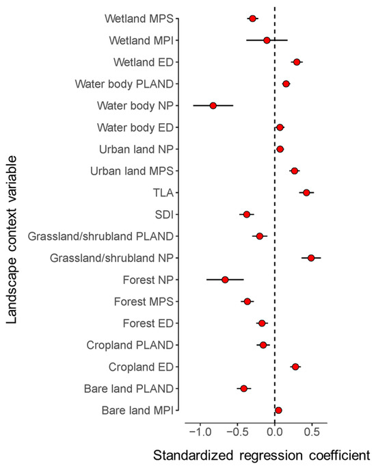 Standardized regression coefficients at the scale of peak explanatory power (i.e., the spatial scale of 5 times the area of each Ramsar site), reflecting the relative impact of each landscape context variable on the species richness of threatened migratory wetland birds. Red points denote the estimated expectation of a coefficient, and error bars denote the standard error of the estimate. See Tables S1–S3 for more information on the output from the GLMMs after model selection. The values shown in this graph are identical to those in the column “Spatial scale (times) 5” under Migratory in Table S1.