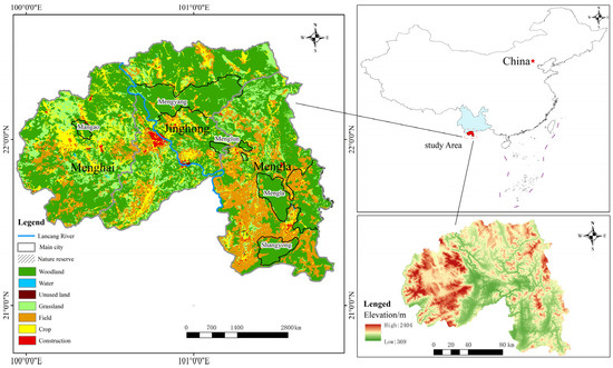 The Xishuangbanna Dai Autonomous Prefecture in the southern part of Yunnan, China, is situated in the Hengduan Mountains (Figure 1). The geographic coordinates range from 21°08′ to 22°36′ N latitude and 99°56′ to 101°50′ E longitude, encompassing an area of approximately 19,100 km2. The topography of Xishuangbanna is characterized by high elevations surrounding a lower central basin, creating significant terrain variations across the region [28].