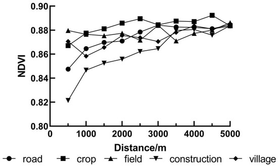 To accurately estimate the maximum impact distances of various threat factors, the Normalized Difference Vegetation Index (NDVI) was used as a proxy indicator for habitat quality [35]. ArcGIS distance analysis tools were applied to examine the trend of NDVI values in relation to increasing distances from the identified threat factors. The analysis revealed that the maximum impact distances for different threat factors varied between two and four kilometers (Figure 2) [36,37]. These calculated maximum impact distances were incorporated into the model to capture the spatial influence of each threat factor on habitat quality.