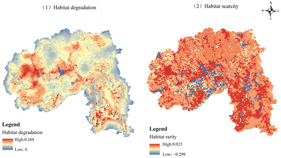 Habitat scarcity is also notably high throughout the study area, particularly in the western and southern regions. These regions are characterized by both high degradation and high scarcity, identifying them as vulnerable areas that might require urgent ecological protection measures. The central region shows lower habitat scarcity but is adjacent to high degradation zones, suggesting a potential risk for further ecological decline.