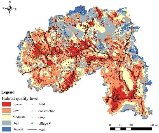 Higher habitat quality is generally observed in the northern region, whereas the southern and central regions exhibit lower-quality habitats. The lowest-quality areas are primarily found along major roads, particularly in the southeastern and southwestern parts of the study area. These regions are in close proximity to orchards, high-grade administrative villages, and croplands, indicating a clear correlation between intensive land use and reduced habitat quality.