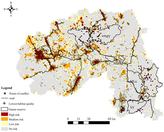 The integration of habitat quality and human–elephant conflict (HEC) risk models has provided a comprehensive framework for conservation planning in Xishuangbanna, highlighting critical areas where targeted interventions are necessary. The spatial analysis revealed significant overlap between high-risk HEC zones and regions of low habitat quality, particularly around key protected areas, such as the Mengyang (MY), Mengla (MLa), and Shangyong (SY) reserves. These findings indicate that areas with intensive human activity and degraded habitats are at the highest risk for human–elephant conflicts, underscoring the urgent need for focused management strategies in these regions.