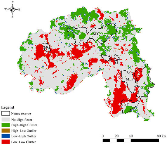The spatial clustering of different habitat quality levels, highlighting the locations of high–high clusters near the Mengyang protected areas and low–low clusters in the western and southeastern regions. (MG = Mangao, MY = Mengyang, ML = Menglun, MLa = Mengla, SY = Shangyong).