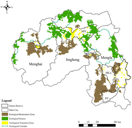 By identifying Ecological Source Areas and Ecological Restoration Zones, this study offers a strategic approach to prioritizing conservation efforts. Ecological Source Areas were identified in places of high-quality habitats, mainly situated in the northern and peripheral regions. These require strict protection to preserve their ecological integrity. Ecological Restoration Zones were identified in areas of significant habitat degradation and high conflict risk, as described in Section 4.3. Specifically, areas classified as low–low clusters indicate severe habitat degradation, and are primarily concentrated around Shangyong (SY), Menggao (MG), and Menglun (ML) (Figure 6), with significant overlap with high-risk conflict (Figure 5). These require targeted restoration actions to improve habitat quality and mitigate conflict risks. From these, ecological corridors were proposed to strategically connect high-quality habitats while avoiding high-risk zones. These are crucial for enhancing habitat connectivity and reducing landscape fragmentation, thereby supporting the safe movement of Asian elephants and other wildlife.