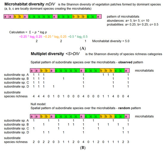 Multiplet Diversity describes the spatial variability of species richness, i.e., it is a beta diversity measure (Figure 2B,C). In this paper, we focus on the relationship between dominant and subordinate species. Therefore, for calculating Multiplet Diversity, we used only subordinate species. However, Multiplet Diversity can be calculated for the whole community or for any other species group.