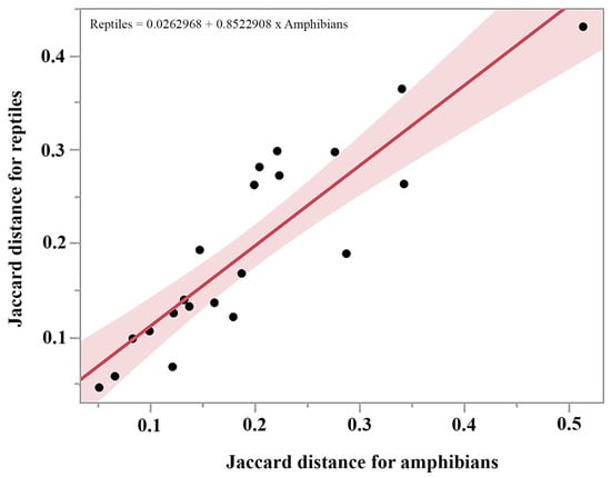 The correlation between the Jaccard distance of amphibians and reptiles among the Chihuahuan Desert and its neighboring biogeographic provinces, with the trend line and 95% confidence intervals.
