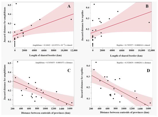 The correlation between the length of the shared border between neighboring biogeographic provinces and the Chihuahuan Desert and the Jaccard distance of (A) amphibians and (B) reptiles and the correlation between the distance between centroids of the Chihuahuan Desert and its neighboring biogeographic provinces and the Jaccard distance of (C) amphibians and (D) reptiles, with the trend line and 95% confidence intervals.