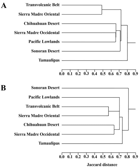 The hierarchical cluster analysis for amphibians revealed distinct groupings among the biogeographic provinces (Figure 6A). One pair consists of the Transvolcanic Belt with the Sierra Madre Oriental. A second group includes the CD, the Pacific Lowlands, and the Sierra Madre Occidental. This group of three provinces joins the Sonoran Desert. This group of four provinces then combines with the group formed by the Transvolcanic Belt and the Sierra Madre Oriental. Finally, these two groups are joined by the Tamaulipas province, which is isolated from the others and exhibits the lowest similarity with them.