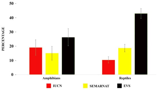 Percentage (±1 S.E.) of amphibian and reptile species with conservation concern status [], categorized as threatened (A) or in danger of extinction (P) by the Mexican government [], or deemed to have a high Environmental Vulnerability Score (EVS) [,], for the Chihuahuan Desert biogeographic province of Mexico.