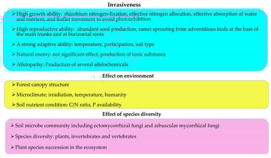 Several review articles for R. pseudoacacia describing its afforestation, utilization, biology, and management are available [1,2,4,11,17,18,20]. The information on the invasive characteristics of R. pseudoacacia has been accumulated over three decades. However, there has been no review article focusing on the invasive characteristics of R. pseudoacacia and its impacts on species diversity. This review provides an overview of the invasive characteristics and the impacts of R. pseudoacacia on the species diversity in the introduced ranges. The literature has been searched using a combination of the predominant online search engines: Scopus, ScienceDirect, and Google Scholar, and all possible combinations of R. pseudoacacia with the following words: invasion, adaptation, botany, habitat, plasticity, reproduction, succession, impact, natural enemy, allelopathy, allelochemical, and secondary metabolite.