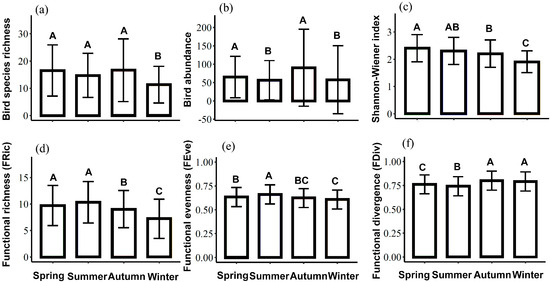 APA StyleZhang, W., Zhao, S., Yang, X., Tian, J., Wang, X., Chen, D., Yu, Y., Shi, J., Cui, P., & Li, C. (2024). Effects of Land Cover on the Taxonomic and Functional Diversity of the Bird Communities on an Urban Subtropical Mountain. Diversity, 16(2), 107. https://doi.org/10.3390/d16020107