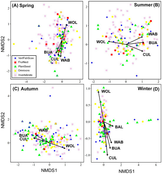 - Wilman, H.; Belmaker, J.; Simpson, J.; de La Rosa, C.; Rivadeneira, M.M.; Jetz, W. EltonTraits 1.0: Species-level foraging attributes of the world’s birds and mammals. Ecology 2014, 95, 2027. [Google Scholar] [CrossRef]