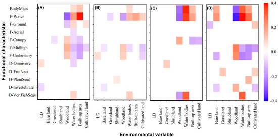 3.6. Associations between Land Cover Types and Bird Functional Characteristics