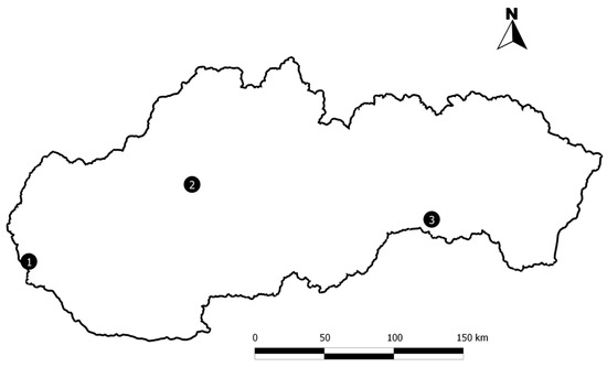 Map showing study areas: urbanized habitat (1—Bratislava, 2—Prievidza) and natural habitat (3—Drienovec) [14].