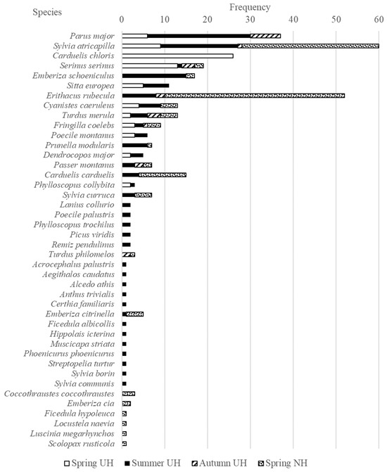 Frequencies of the bird species captured in urbanized (UH) and natural (NH) habitats in Slovakia.