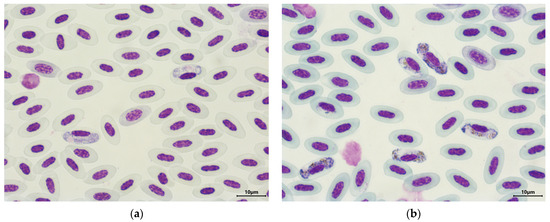 A drop of blood was used to prepare blood smears, and 2 thin smears were prepared per individual of a total of 302 birds. All smears were air-dried, fixed in methanol (96%), and stained with Giemsa stain, as described in Valkiūnas [1]. The smears were examined using a Leica DM4500B microscope (Wetzlar, Germany), and images were taken with a Leica DFC480 camera (Wetzlar, Germany). Approximately 100 fields were scanned under ×400 magnification, and at least 100 fields were subsequently examined under high magnification (×1000) (oil immersion). The intensity of parasitemia was determined according to the count of infected blood cells per 10,000 erythrocytes as follows: low (1–10 parasites), medium (11–100 parasites), or high (more than 100 parasites) according to Valkiūnas [1]. Images for the identification of parasites were edited using the program Leica Image Manager (Wetzlar, Germany). Determination of the haemosporidians was performed based on keys for morphological identification developed by Valkiūnas [1,2]. The smears were deposited at the Institute of Virology, Biomedical Research Center, SAS, Bratislava, Slovakia.
