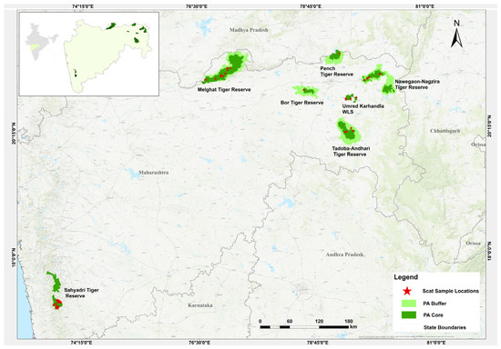 This study was conducted in the Vidarbha landscape (VL) of Maharashtra, India. The landscape has a forest cover of 22,508 sq km, accounting for areas both inside and outside of protected areas [27]. The major protected areas of the VL in which sampling was conducted include the Melghat Tiger Reserve (MTR, 2768.52 sq km), Sahyadri Tiger Reserve (STR, 1166 sq km), Tadoba Andhari Tiger Reserve (TATR, 1727.59 sq km), Bor Tiger Reserve (BTR, 816.27 sq km), Navegaon-Nagzira Tiger Reserve (NNTR, 1894.94 sq km), Pench Tiger Reserve (PTR, 741.22 sq km) and Umred-Karhandla Wildlife Sanctuary (UKWLS, 189 sq km) (Figure 1).