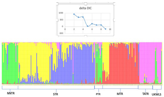 The average value for Fis was 0.095 and that for Fst was 0.09 based on 13 loci [28]. The Nm after correcting for size was 2.69. TESS assigned a cluster value of 5 for the populations of sloth bears based on the lowest value of DIC before reaching a plateau (Figure 2). The TESS results showed that neighboring populations of the TATR and UKWLS were assigned to one genetic cluster, with UKWLS samples sharing some genetic signature with the adjacent NNTR population (Figure 2). The populations of the NNTR and PTR formed the next cluster, with PTR samples showing some links to the MTR population. The majority of samples from the MTR were assigned to a third genetic cluster, while a small part of the MTR population grouped with samples from the STR into a common cluster, and the remaining part of the STR population was assigned to a separate group.