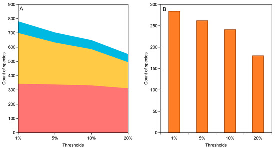 A species can be regarded as a potential beneficiary species to the flagship species when a sufficiently high P1 or P2 value is observed. In this study, multiple thresholds were established for both P1 and P2 (namely, 1%, 5%, 10%, and 20%), culminating in a total of 16 combined criteria. For each flagship species, the number of potential beneficiary species was tallied for each criteria combination separately, serving as the count of potential beneficiary species.