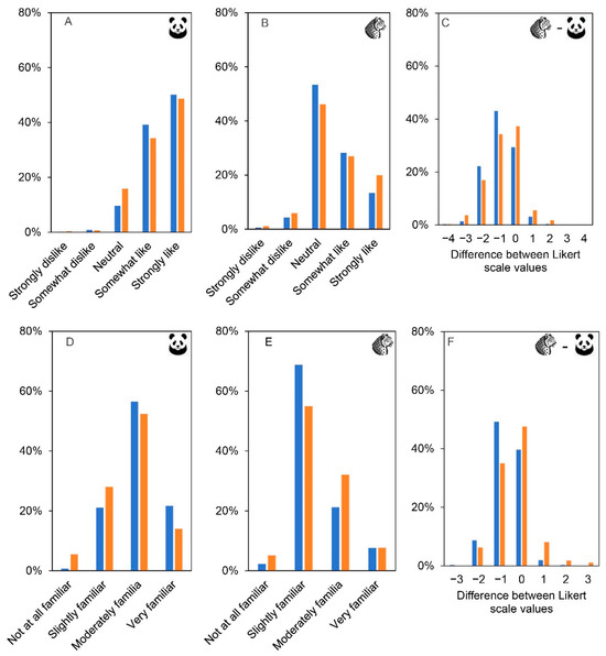 Respondents’ level of affection (A–C) and self-perceived familiarity (D–F) towards the giant panda and snow leopard. Panels (A,D) represent the giant panda; (B,E) denote the snow leopard; (C,F) illustrate the difference in affection and familiarity between the two species. Blue bars indicate respondents from within China, while orange bars are those outside China. Differences in affection and familiarity levels for the two species are derived by subtracting the Likert scale values for the giant panda from those for the snow leopard. Species illustrations were generated by DALL-E.