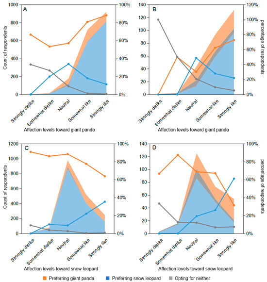 Influence of affection levels toward the giant panda (A,B) and snow leopard (C,D) on the species preference choice. Panels (A,C) show the effects of affection levels among Chinese respondents, while panels (B,D) display the same for respondents outside China. Orange indicates preferring the giant panda, blue for the snow leopard, and gray denotes opting for neither. Stacked areas show respondent counts, and lines represent percentage distributions of preferences.