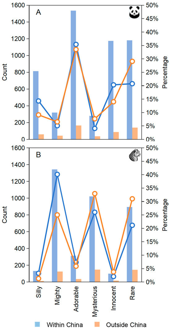 Perceptions of the giant panda (A) and snow leopard (B) among respondents. Blue represents responses from China, while orange represents those outside China. Bars indicate the counts of respondents choosing each impression, while the lines with circles present the weighted percentage of selections for each impression.