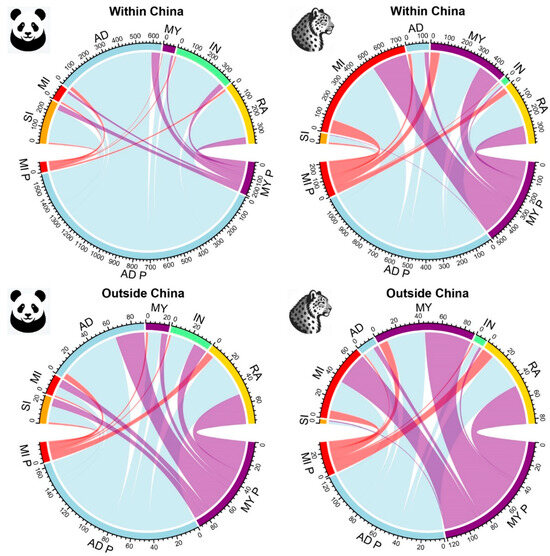 Chord diagrams show the associations between respondents’ perceptions of the species and their preferred photo. The upper half of the diagram indicates the weighted number of respondents selecting each impression, while the lower half illustrates the photo they chose. “SI” represents the perception of the giant panda or the snow leopard as “Silly”, “IN” for Innocent, “AD” for Adorable, “MY” for Mysterious, “MI” for Mighty, and “RA” for Rare. “MI P” corresponds to the Mighty Photo of the giant panda or the snow leopard, “AD P” to the Adorable Photo, and “MY P” to the Mysterious Photo.