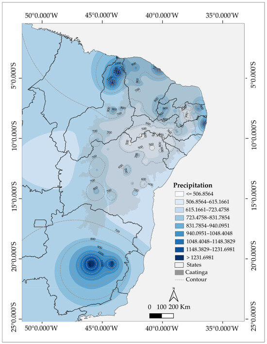 Location of the Caatinga (shaded) region in northeastern Brazil, indicating the precipitation isohyets in the region.