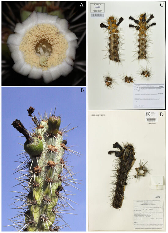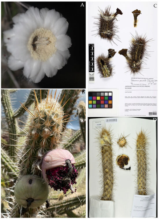 (A) Xiquexique tuberculatus in flower (photo: Sinzinando Albuquerque-Lima); (B) flower bud and fruit of X. tuberculatus (photo: Isadora Schulze de Albuquerque); (C) exsiccate of X. tuberculatus (including flower), Universidade Estadual de Feira de Santana Herbarium; (D) exsiccate of X. tuberculatus (including fruit), Universidade Federal Rural de Pernambuco Herbarium.