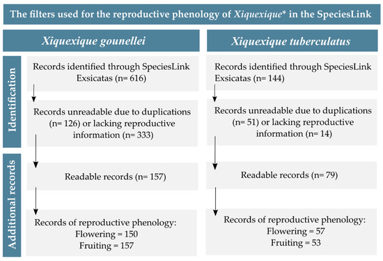Flowchart of the filtering steps in the selection of phenological data concerning X. gounellei and X. tuberculatus on the SpeciesLink platform. * All species belonging to the genus were filtered, but only X. gounellei and X. tuberculatus were selected for comprehensive filtering in this study.