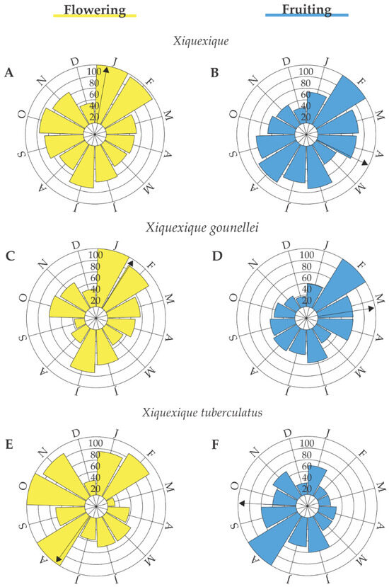 Xiquexique gounellei, however, demonstrated a notable flowering peak in February and its greatest fruiting in March (Table 1). Circular statistical analysis showed that the second day of February represented the peak of flower production (p < 0.05), while a high proportion of individuals formed fruits on March 23 (p < 0.01) (Table 1, Figure 5). In contrast, X. tuberculatus evidenced a flowering peak in August–October and a fruiting peak in August (Figure 5), with the highest proportion of individuals producing flowers on the second day of October (p < 0.19), and the highest proportion of individuals producing fruits on August 5 (p < 0.02) (Table 1).