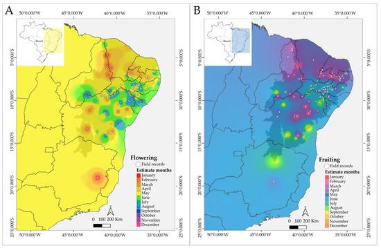 Probable flowering (A) and fruiting (B) months of the genus Xiquexique according to IDW interpolation. The colors indicate the best months for excursions. White dots represent herbarium specimens.