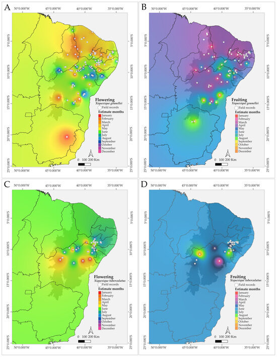 Probable flowering (A) and fruiting (B) months of Xiquexique gounellei, and the probable flowering (C) and fruiting (D) months of Xiquexique tuberculatus, according to IDW interpolation. The colors indicate the best months for field excursions. White dots represent herbarium specimens.