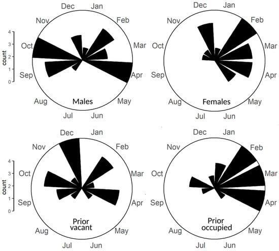 Radial illustrations of monthly distribution in estimated first territory settlement dates according to: upper panels, prior occupancy status of the settled territory (occupied: n = 19; vacant: n = 27); and lower panels, sex (male: n = 25; female: n = 21).