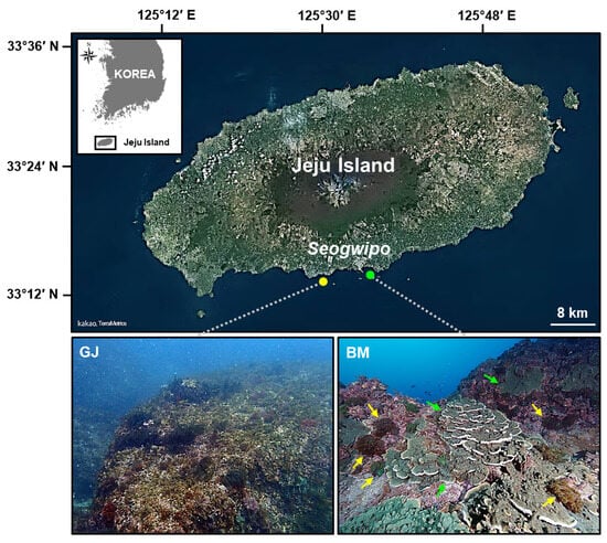 Map showing the locations of two survey sites (Gangjeong (GJ) and Bomok (BM)) situated off the southern coast of Jeju Island, Korea, and the foreground autonomous reef monitoring structure (ARMS) photo (map source: https://map.kakao.com; accessed on 30 June 2023). The colonies of scleractinian coral Montipora millepora (green arrow) and Alveopora japonica (yellow arrow) were observed at the BM site.