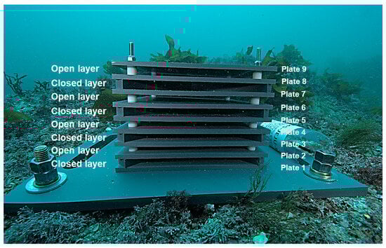The settlement of benthic organisms is significantly influenced by hydrodynamic and biological factors, including light, nutrients, surface orientation, color, depth, and biochemical cues []. To assess the communities, it is important to understand the influences of environmental conditions [], mechanisms of colonization, and succession of benthic assemblages []. However, evaluating their impacts on benthic ecosystems remains challenging owing to the absence of universally standardized monitoring tools []. Therefore, the monitoring and assessment of various descriptors encompassing biological components, such as community composition and biodiversity, demand the utilization of innovative methods and approaches [,,,,,].