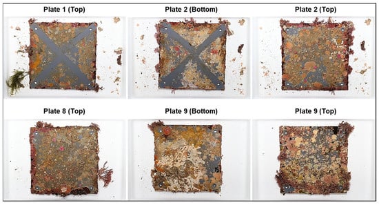 The ARMS units were installed by scuba divers (Figure 2) and submerged for 12 months (1-year) and 34 months (3-years) at BM and GJ, respectively, following which they were retrieved and transported to the laboratory for subsequent processing and analysis. During the dismantling of the ARMS, each plate (nine plates per ARMS) was carefully brushed to remove mobile organisms without detaching sessile organisms from the filtered seawater. The plates were subsequently immersed in aerated seawater until photographs were obtained (Figure 3).