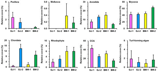 The dominant groups found on the plates included Annelida, Bryozoa, Chordata, Rhodophyta, and CCA (Figure 4). In contrast, Porifera, Mollusca, and turf-forming algae exhibited low abundance and distribution on the plates. Members of the phylum Bryozoa dominated colonization, with 63.1% in BM-2, 45.0% in BM-1, 42.8% in GJ-2, and 42.4% in GJ-1. Chordata was more abundant in the 3-year ARMS units than in the 1-year ARMS units, with 7.3% and 0.3% for GJ and 6.7% and 0.8% for BM, respectively. In contrast, CCA was more abundant in the 1-year ARMS units than in the 3-year ARMS units, with 43.1% and 24.6% in GJ and 30.9% and 15.0% in BM, respectively (Figure 4).