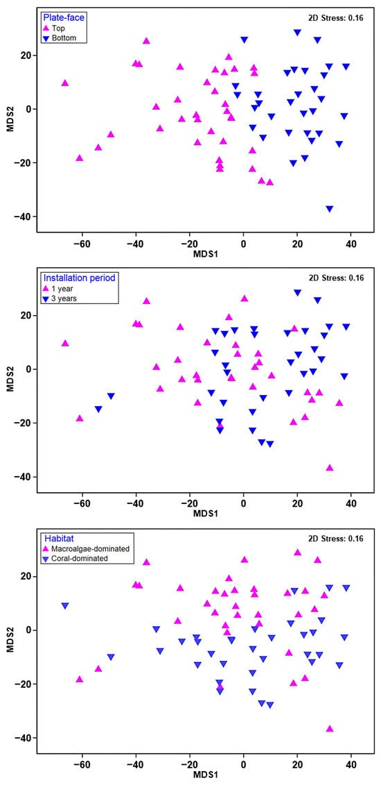 Non-metric multidimensional scaling (nMDS) of sessile benthic categories for the plate faces, installation periods, and habitats of ARMS units. Each point represents a replicate (ARMS plate).