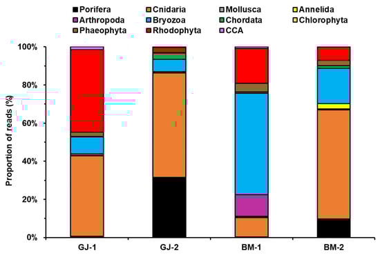 The most abundant taxon in the ARMS biomass samples across the dataset was the phylum Cnidaria, except for BM-1, followed by Bryozoa, Rhodophyta, and Porifera. Porifera and Chordata were more abundant in the 3-year ARMS units (GJ-2 and BM-2) than in the 1-year ARMS units (GJ-1 and BM-1). In contrast, members of Rhodophyta and CCA were more abundant in the 1-year ARMS units than in the 3-year ARMS units (Figure 6).