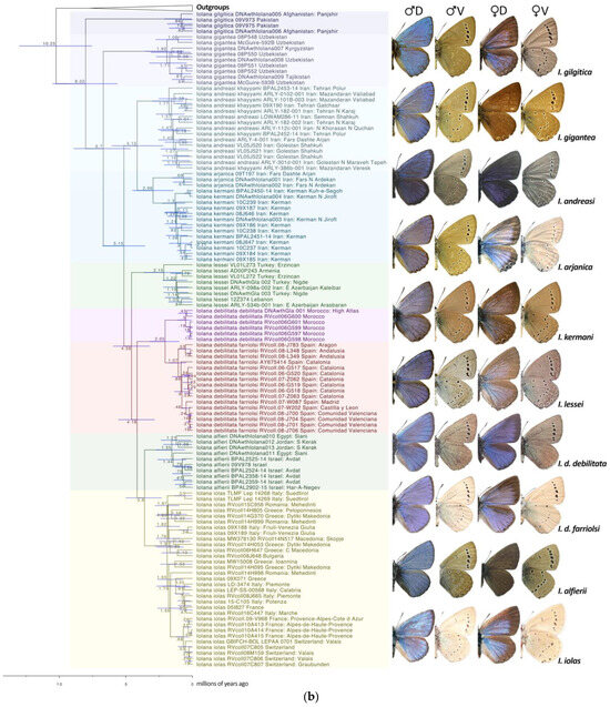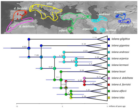 - Lukhtanov and Gagarina [15] suggested that the African and Iberian populations attributed to Iolana debilitata Schultz, 1905 (TL: Algeria) may perhaps represent different species. García-Barros et al. [47] listed three subspecies present in the Iberian Peninsula: ssp. debilitata in Andalusia; ssp. thomasi Hemming, 1931 in Central Spain; and ssp. farriolsi Sagarra, 1931 in the northeast of Iberia. These authors, as well as Dumont [14], describe subtle differences in the male genitalia and the external morphology across the range of these populations. However, our molecular clock analysis, which estimates that the split between the Spanish populations and those in Morocco occurred around 2 mya (Figure 1), does not support the presence of the North African lineage (taxon debilitata) in Spain. On the other hand, a genetic structure roughly correlating with geography is observed within the Iberian populations. Here, we maintain Spanish and African populations under a single species, Iolana debilitata, but with the nominotypical populations restricted to North Africa, and tentatively consider a single subspecies in Spain, I. debilitata farriolsi Sagarra, 1931, possibly with a latitudinal morphological differentiation. A finer population genetics and morphometric study may shed light on the variation within the Iberian Peninsula.