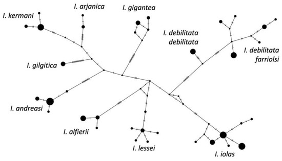 Median-Joining Network of Iolana mitochondrial COI barcode sequences inferred using PopART (popart.otago.ac.nz, accessed on 10 December 2023). Circles are proportional to sample size for each haplotype. Smallest black dots represent unsampled but predicted haplotypes, and mutations are shown as dashes.