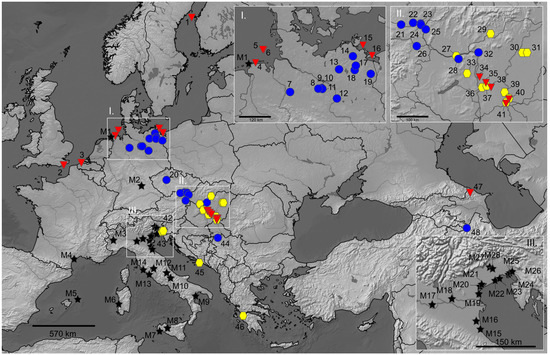 Map showing sampling locations of the Dactylochelifer latreillii species complex, including data from public databases, analyzed in this paper (No. 1–48, Table S3). The upper left insert (I.) shows the sampling locations in northern Germany; the upper right insert (II.) shows sampling locations in central Europe, and the lower right insert (III.) shows locations in northeastern Italy in detail. Different symbols correspond to different Dactylochelifer latreillii lineages according to Just et al. [25]: yellow hexagon: lineage F; red triangle: lineage G; and blue circle: lineage H. The black stars display localities of the museum material observed only morphologically (No. M1-M28, Table S2). All maps were created with the help of an online version of SimpleMappr (https://www.simplemappr.net/).