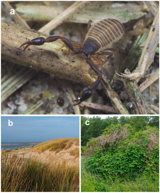 (a) Female Dactylochelifer latreillii from dunes near Ahlbeck, Usedom; (b) Ammophila dunes at Langeoog, habitat of Dactylochelifer latreillii; (c) Riparian bushes with Humulus, habitat of Dactylochelifer degeerii.