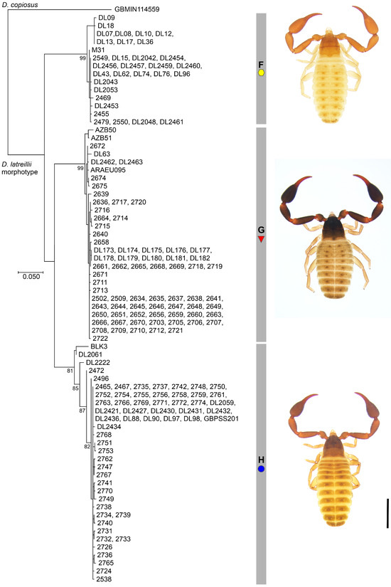 The maximum likelihood tree for the Dactylochelifer latreillii morphotype based on COI sequences (bootstrap support marked > 80). Designation of the lineages corresponds to Just et al. [25]. Illustrations show typical females of each lineage. Scale bar = 1 mm.