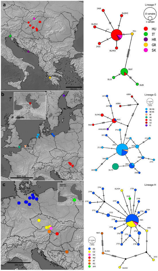 Lineage F comprised 10 unique haplotypes from 32 individuals (Figure 4a). There was a geographic structure in the haplotype network, as most sequences from the Pannonian basin were separated from Italian specimens by 10 mutational steps. However, there was also one shared haplotype between the two regions. Lineage G comprised 22 unique haplotypes from 78 individuals (Figure 4b). We identified a shallow geographic structure in the haplotype network, as most sequences from the northern coasts were separated from Pannonic specimens by few mutational steps. Again, we observed shared haplotypes across the regions. All specimens from Great Britain belonged to one unique halotype with close similarity to haplotypes from the North Sea and Baltic Sea. The most distinct haplotypes originated from the Caspian Sea. In lineage H (with a total of 59 specimens), more than half of the sequences belonged to a single central haplotype, comprising individuals from northern Germany to Hungary (Figure 4c). A sequence from Armenia differed from the central haplotype by just one mutation. More distant haplotypes were obtained from the Balkan Peninsula and the surroundings of Vienna.