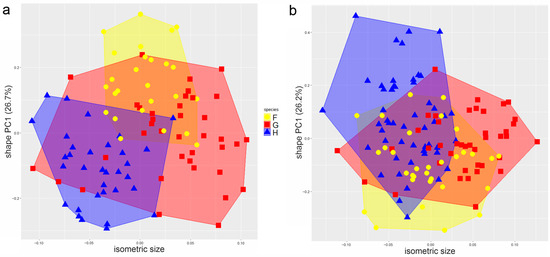 Scatterplot of isometric size against the first axis of shape PCA of the three Dactylochelifer lineages as identified by mtDNA. (a) Males; (b) females.